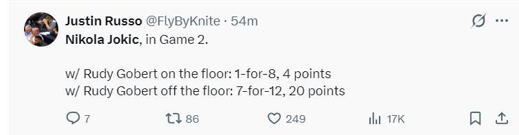 美媒曬出約基奇末節命中率14%,正負值-10的表現,寫道:值得注意的是,約基奇是我們見過所有體育項目中‘數據造假’現象最嚴重的人物。