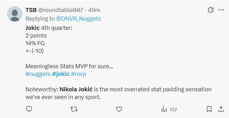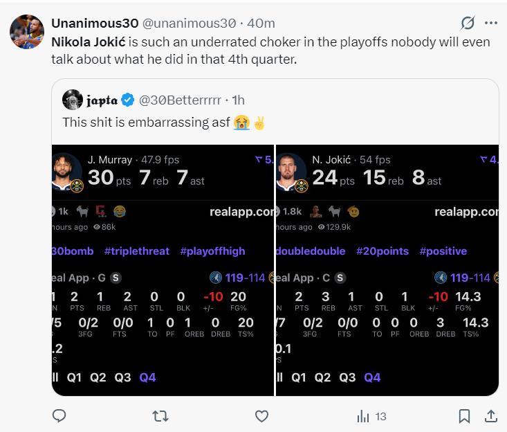 約基奇此役的末節8分鐘裏,7中1,三分2中0,沒有罰球拿到2分3籃板1助攻1蓋帽,命中率14.3%,作爲聯盟一哥來說這個決勝時刻表現太過於拉胯。他決勝時刻的表現也引來多方炮轟。