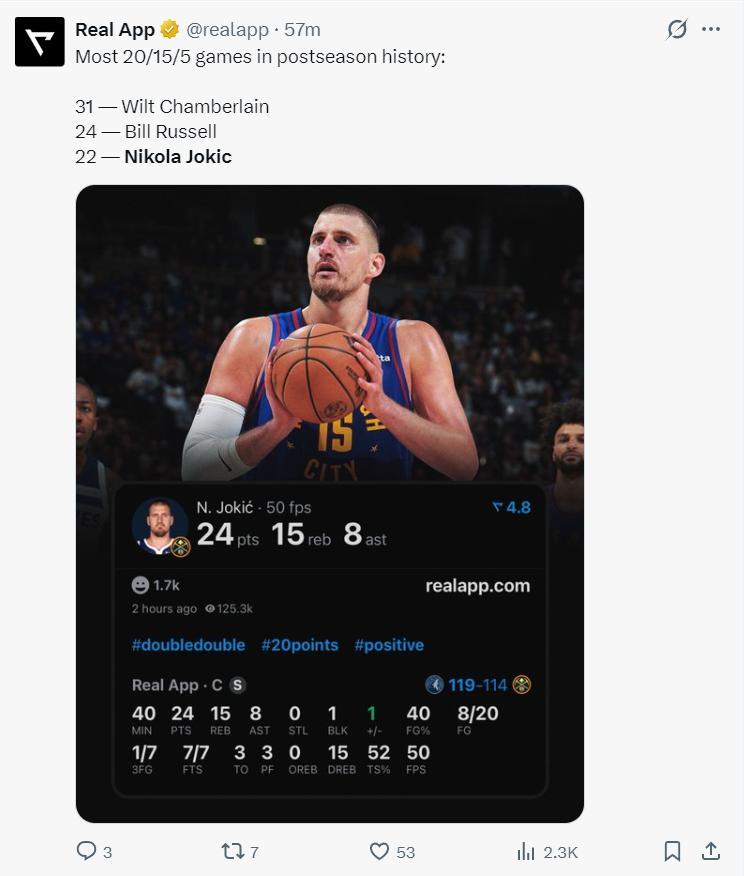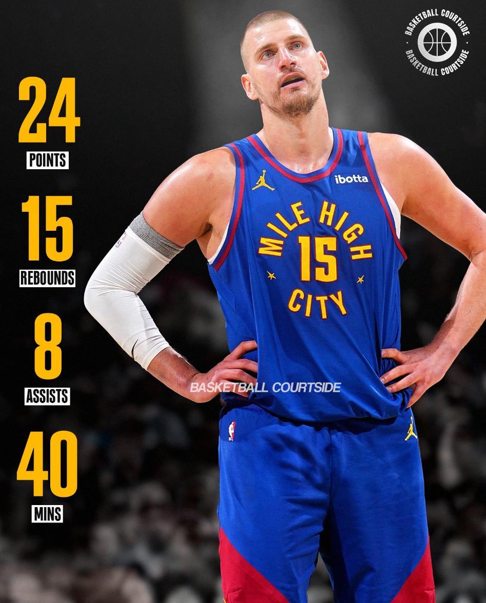 單看約基奇的數據其實不差,全場比賽40分鐘,20中8,三分7中1,罰球7中7,拿到24分15籃板8助攻1蓋帽3失誤,命中率50%,三分命中率14.3%,真實命中率52%,正負值+1。