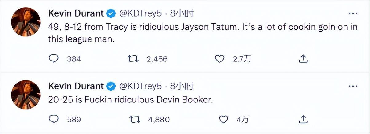 凱文·杜蘭特在布魯克林籃網對華盛頓陣奇才的比賽中,上場37分鐘,僅出手20次就砍下39分外加5籃板5助攻,率領籃網擊敗奇才,喜提三連勝。衆所周知,杜蘭特酷愛上網衝浪。賽後,也許他只是贏球心情大好順便想在網上找個網友對線,也許他還想看看今天誰表現得比他更帥。總之沒過多久,杜蘭特就忍不住地在推特上對波士頓凱爾特人前鋒傑森·塔圖姆和菲尼克斯太陽後衛德文·布克口吐芬芳。