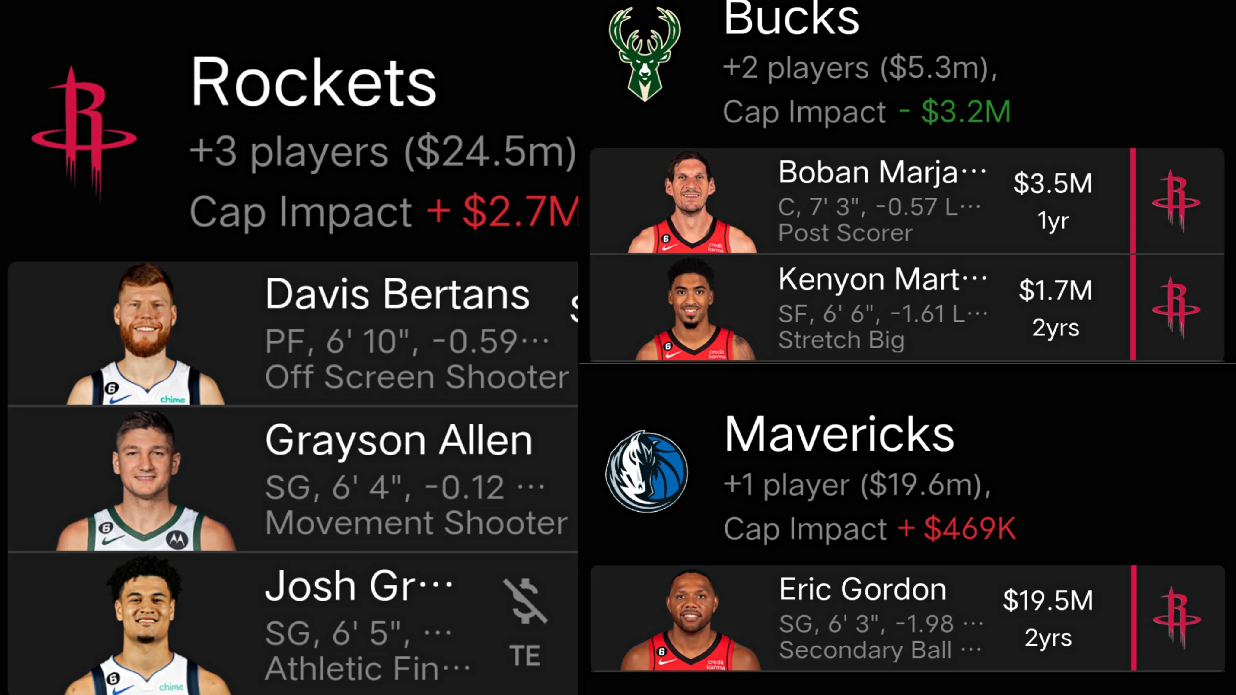 據美媒報道的消息,火箭、獨行俠和雄鹿隊三支球隊正商討一筆6人交易方案,如果交易達成,獨行俠將迎來第六人戈登,組成以火箭舊將爲主的替補陣容,雄鹿則得到火箭扣將小馬丁,具體交易報價方案爲: