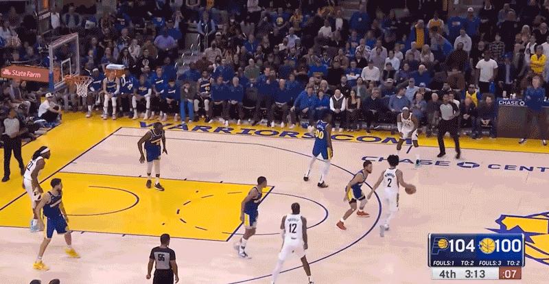全場比賽最有代表性的一個回合,發生在終場前3分10秒左右。雖然步行者還保持4分領先,但勇士此時也正在做最後的反撲。內姆哈德頂弧持球直接面對庫裏,利用嫺熟的胯下運球與假動作,讓庫裏的防守重心偏移,差點摔倒。而這個步行者的菜鳥看準機會一個後撤步,在庫裏和庫明加兩個人的蓋帽到位前,將手裏的球朝籃筐投去。三分隨即命中,步行者將領先優勢擴大到了7分,也將勇士反撲的氣焰壓制了下去。