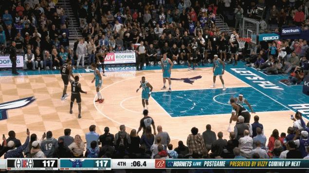 比賽最後6秒,洛杉磯快船與夏洛特黃蜂戰成117平,包括保羅·喬治在內的所有快船球員主動爲萊昂納德清空一側。面對着黃蜂隊身高2米08的鋒線杰倫·麥克丹尼爾斯的防守,他持球先做了試探步之後緊接着一個投籃假動作,隨後是一記乾脆利落後撤步中投,籃球刷網而過。
