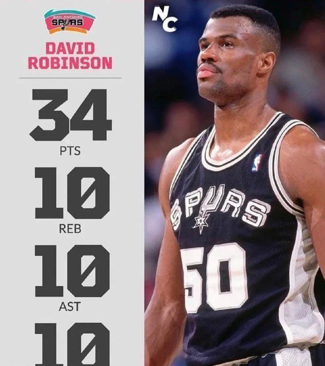 在鄧肯之前,馬刺絕對的大明星就是綽號海軍上將的大衛-羅賓遜了。而在1994年一場馬刺對陣活塞的比賽中,海軍上將一個人狂砍34分,除此之外,還拿到了10籃板、10助攻和10次封蓋的四雙數據!這也是NBA賽場爲數不多的四雙,砍下34分說明羅賓遜是馬刺的進攻核心,10籃板說明他是內線支柱、10助攻說明他像控衛一樣串聯球隊,10封蓋則還證明他在內線一柱擎天,這樣的數據,真的是難得一見。