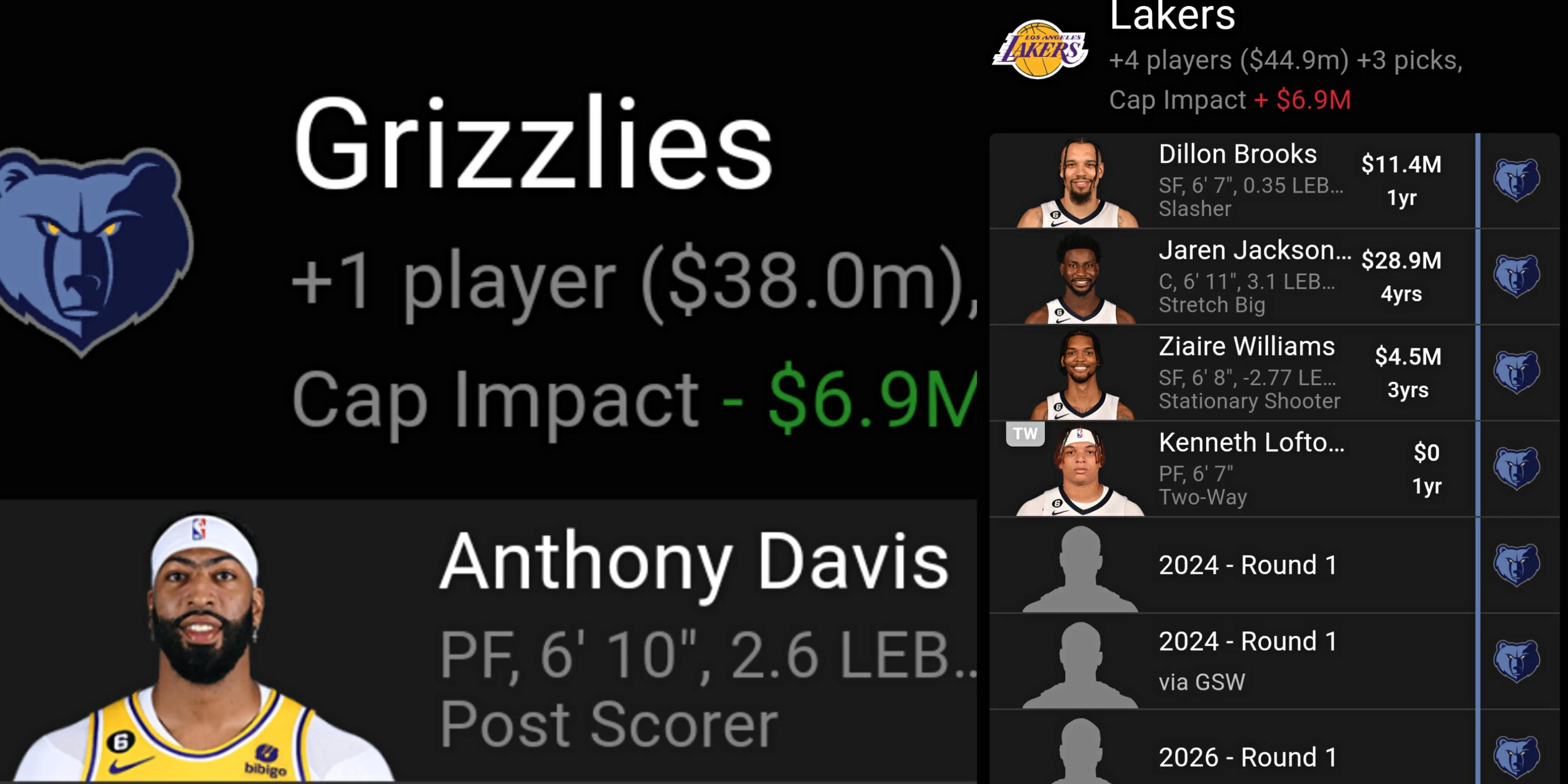 據美媒報道的消息,湖人與灰熊7換7交易方案,具體細節爲:湖人送濃眉到灰熊,得到灰熊隊狄龍-布魯克斯、小賈倫-傑克遜、宰伊爾-威廉姆斯、洛夫頓、3個首輪籤(2024年灰熊首輪、2024年勇士首輪和2026年灰熊首輪)