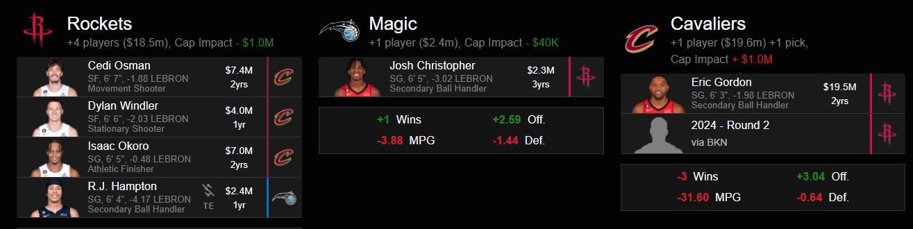 火箭送戈登和2024年籃網次輪簽到騎士,從騎士得到奧斯曼、溫德勒、奧科羅,火箭送託弗到魔術,從魔術得到年輕後衛漢普頓。