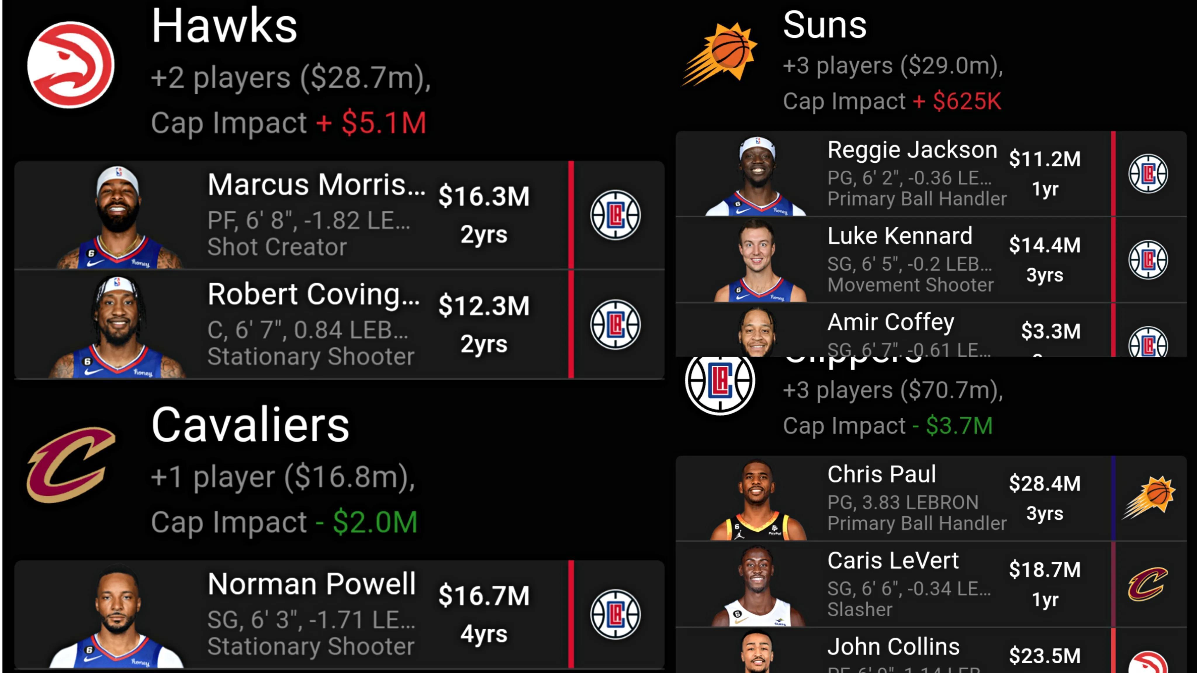 太陽化整爲零,送出年邁保羅,得到了三位輪換球員,老鷹解決了科林斯的合同,得到了考文頓和莫里斯這兩位適合小球戰術的前鋒,騎士得到了有鮑科比之稱的得分後衛鮑威爾。