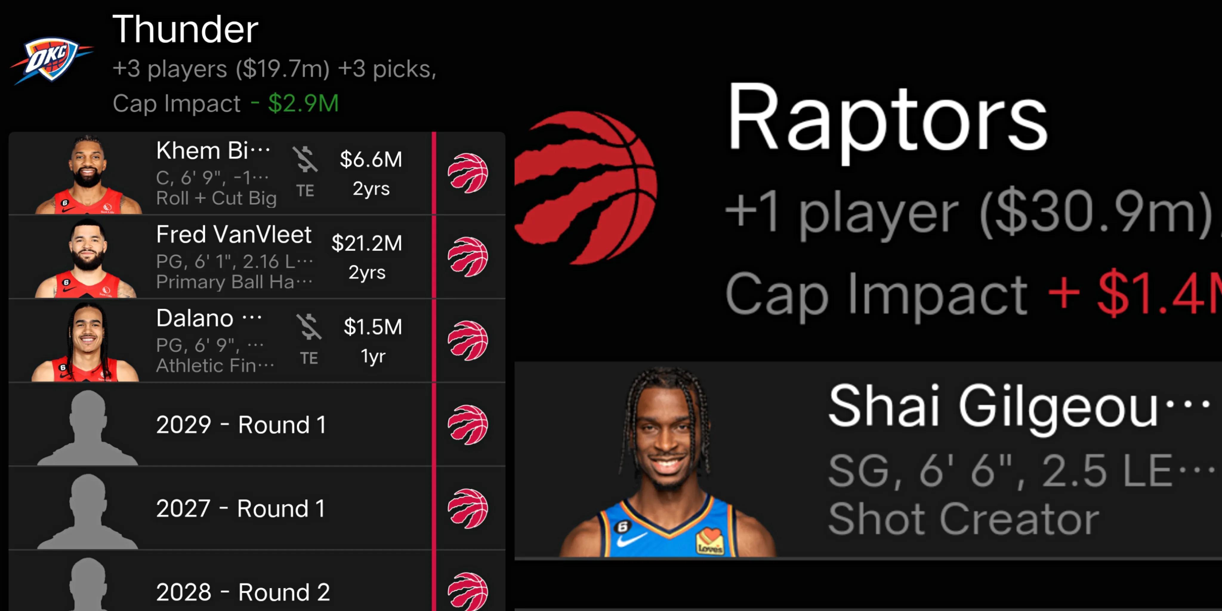 猛龍還在這筆交易中送出了送出了2個首輪籤和一個次輪籤,這是雷霆需要的重建資產,雷霆隊已經重建多年,球隊有很多年輕的天賦球員,後衛線上有基迪、多特、杰倫-威廉姆斯和特里-曼等多位年輕球員,但是戰績並沒有提升,因此球隊可能會願意交易亞歷山大,換來一位更有經驗的後場老將來帶領球隊。
