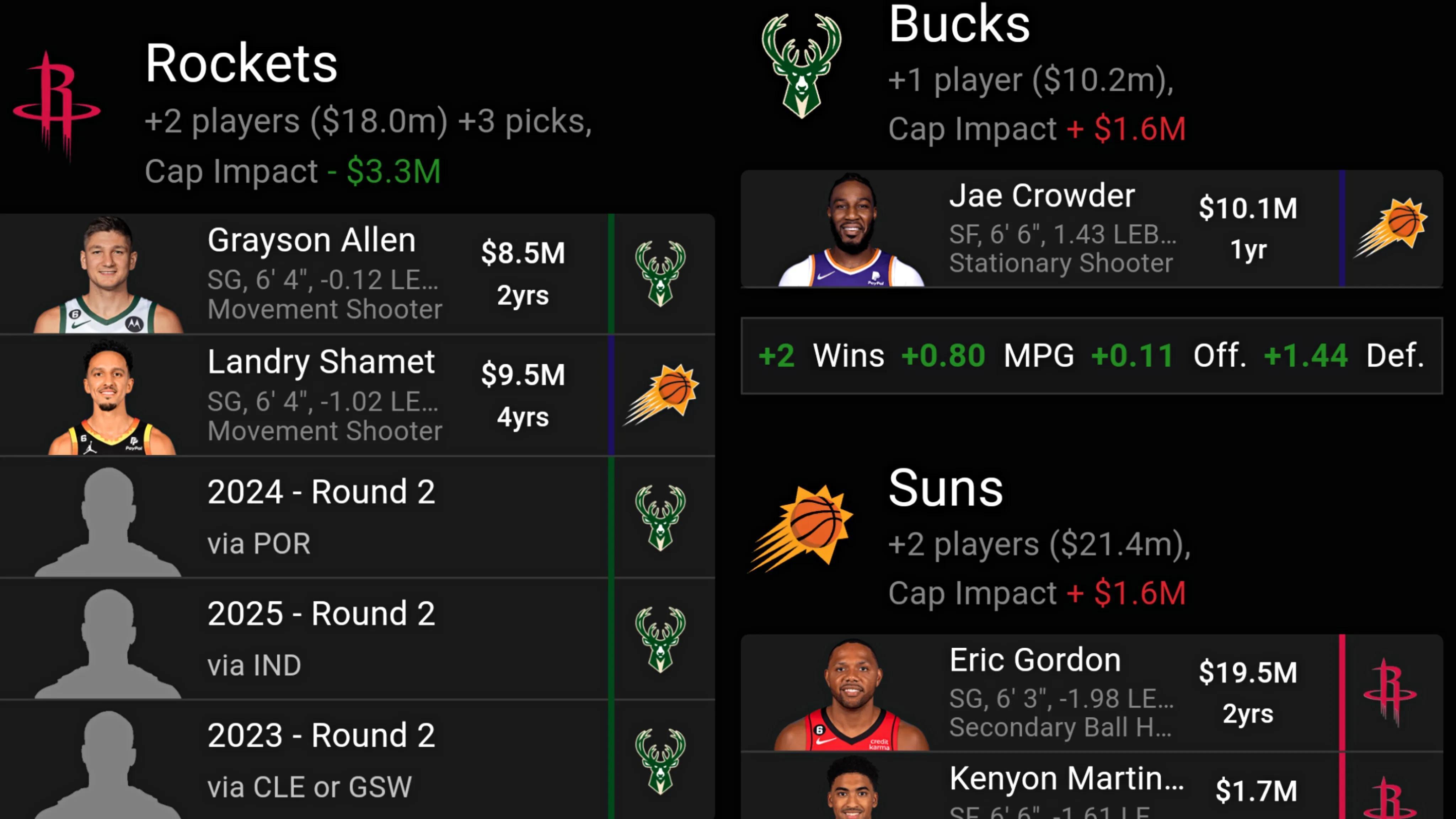 這筆交易更像是太陽和雄鹿聯手爲火箭做的局,他們兩家各取所需,得到了即戰力球員和防守悍將,但是火箭除了幾個沒價值的次輪籤,什麼也沒撈着。