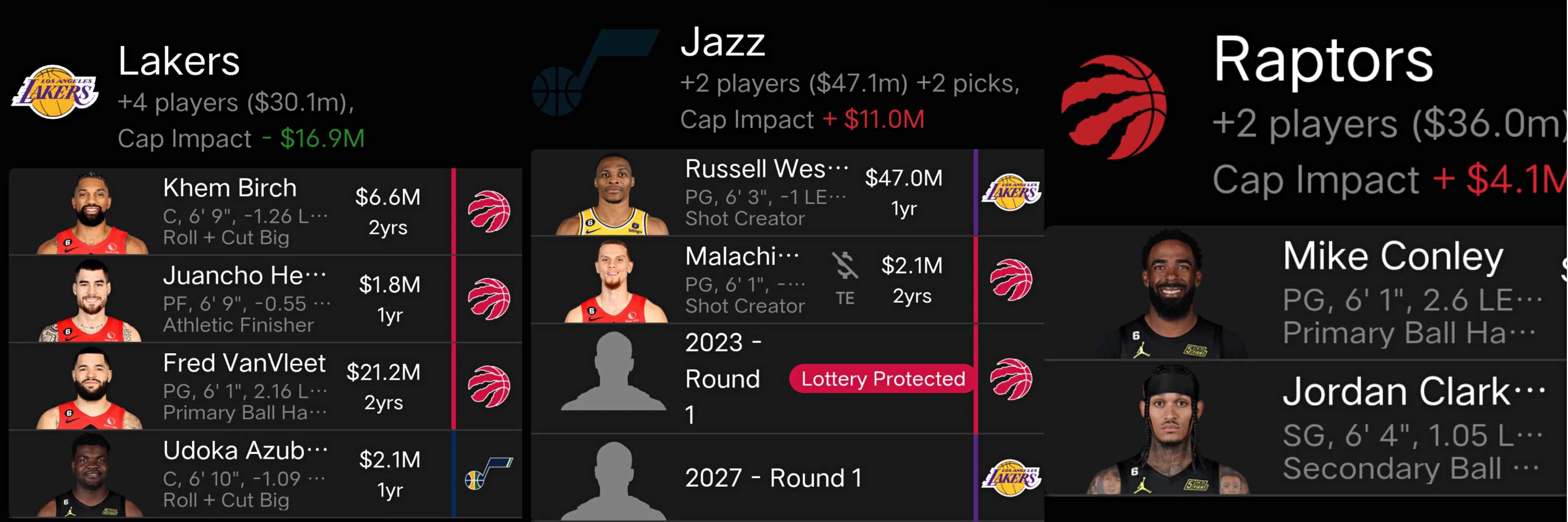 爵士送出老將後衛康利、第六人克拉克森、阿祖布克,得到湖人隊威少和2027年首輪籤,從猛龍得到25歲的後衛弗林以及2023年樂透保護的首輪籤。