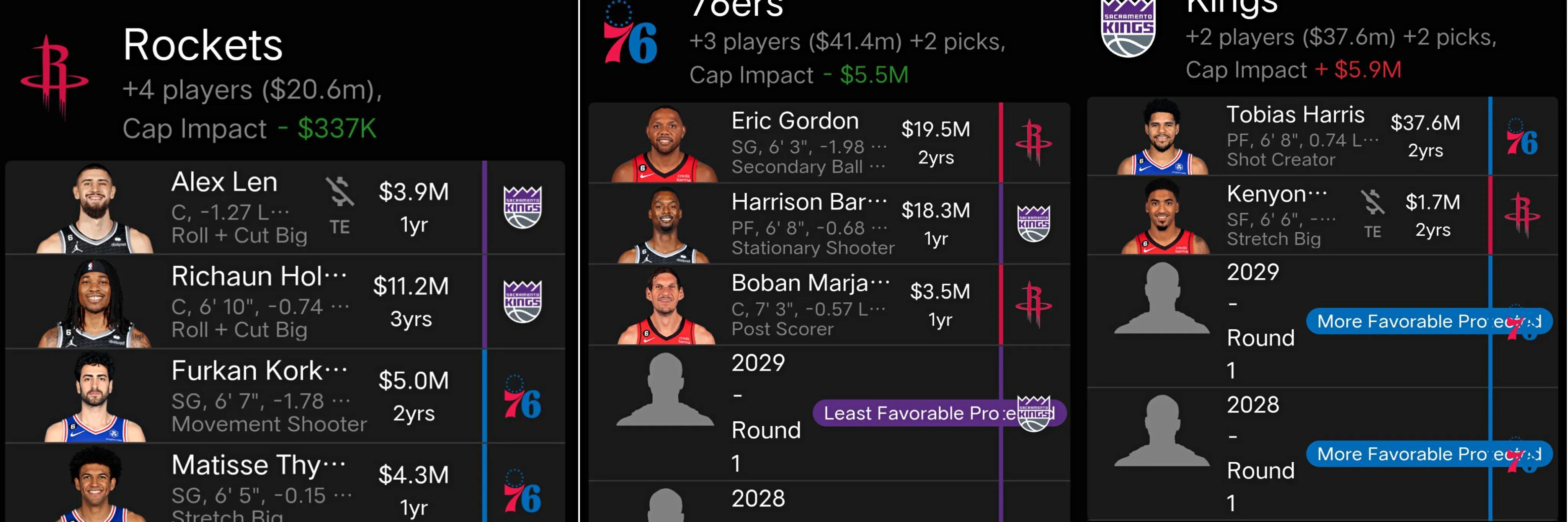 火箭送出老將戈登和博班,要求離隊的小馬丁,得到76人和國王送出的角色球員,29歲的前鋒霍姆斯和30歲的中鋒萊恩都不在火箭的計劃中,25歲的高個後衛科爾克馬茲和26歲的前鋒塞布爾也都基本定型,並不是一個合適的輪換球員。