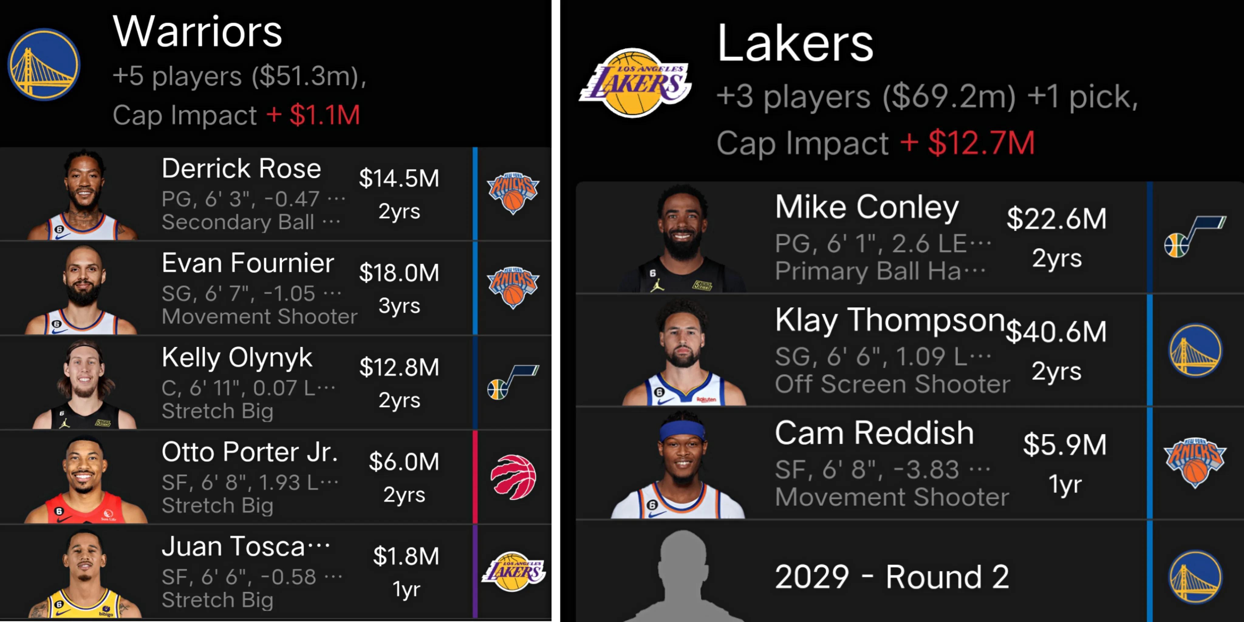 得到:康利、克萊、雷迪什、2029年勇士次輪選秀權