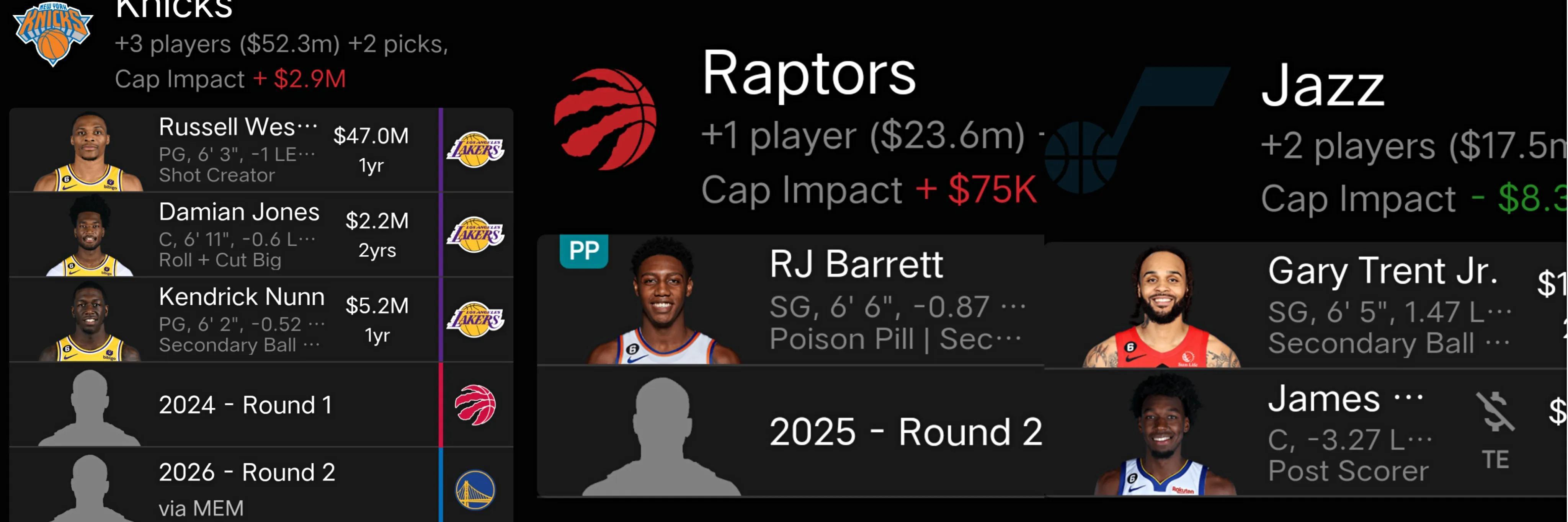 據消息人士透露,勇士與湖人、爵士、尼克斯和猛龍五隊正商討一筆涉及14名球員的交易報價方案,具體內容爲:
