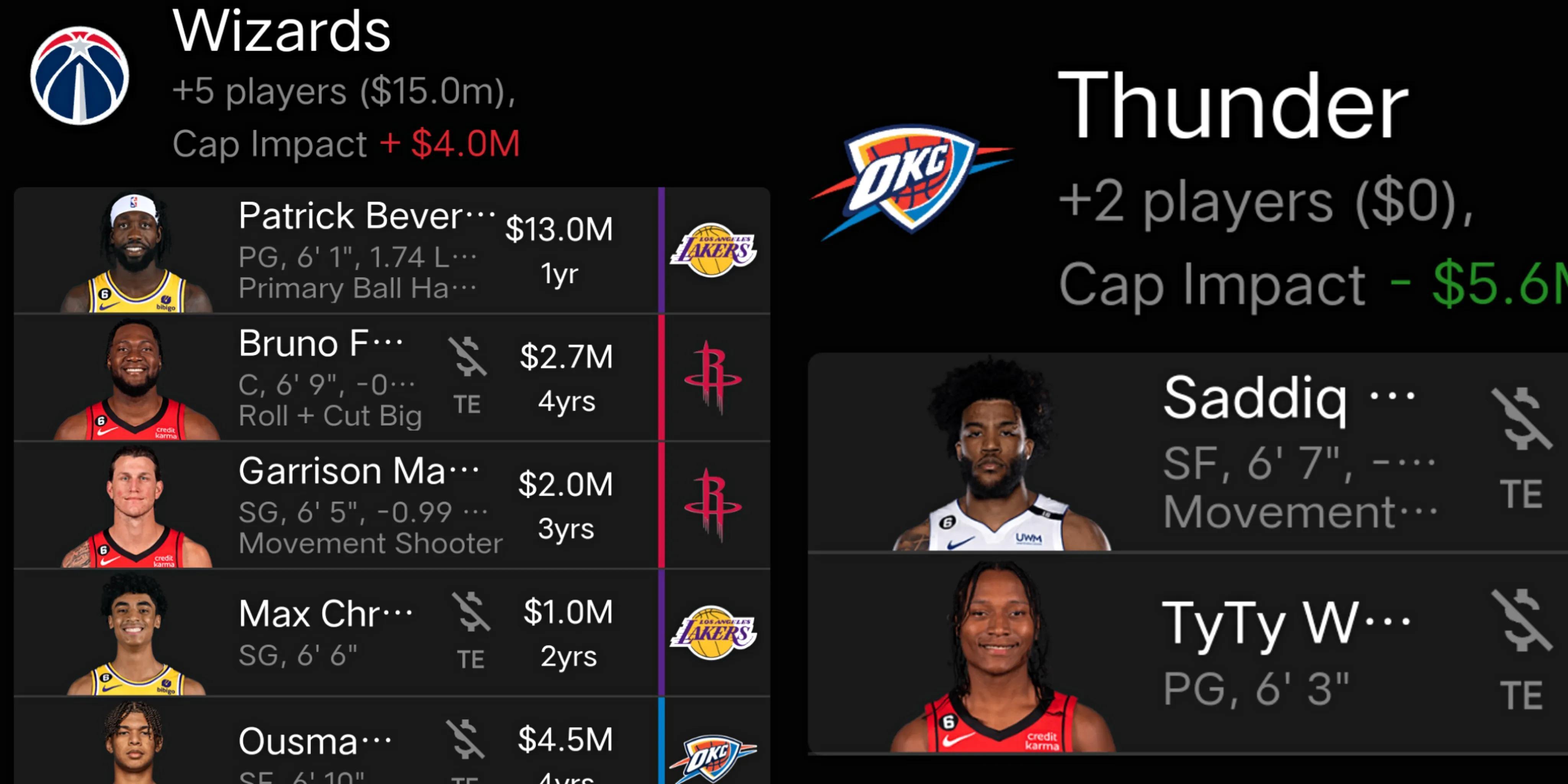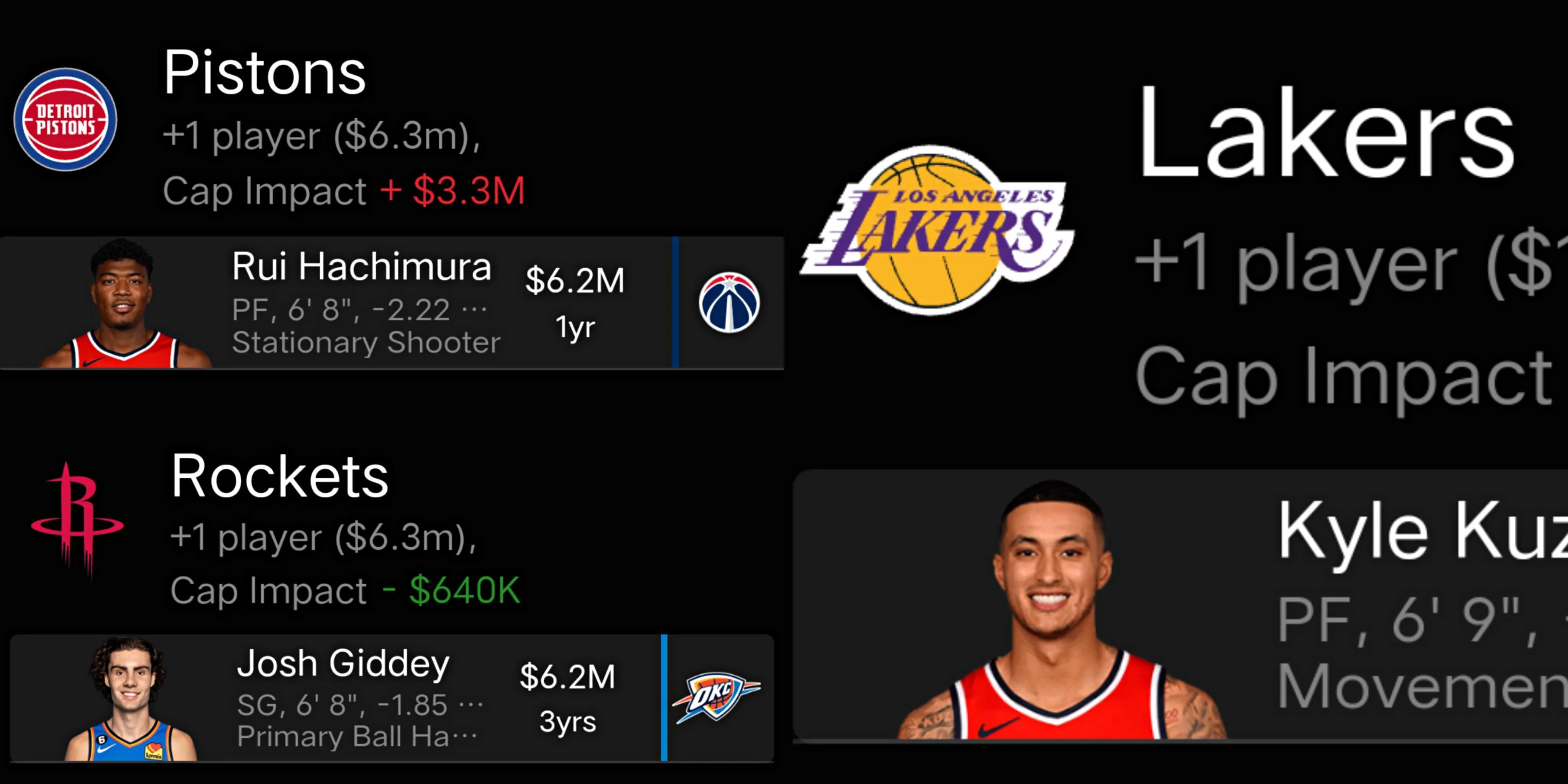活塞送出薩迪克貝,得到八村,奇才送出庫茲馬、八村,得到貝弗利、費爾南多、馬修斯、迪昂,雷霆送出吉迪、迪昂,得到薩迪克貝、泰泰。