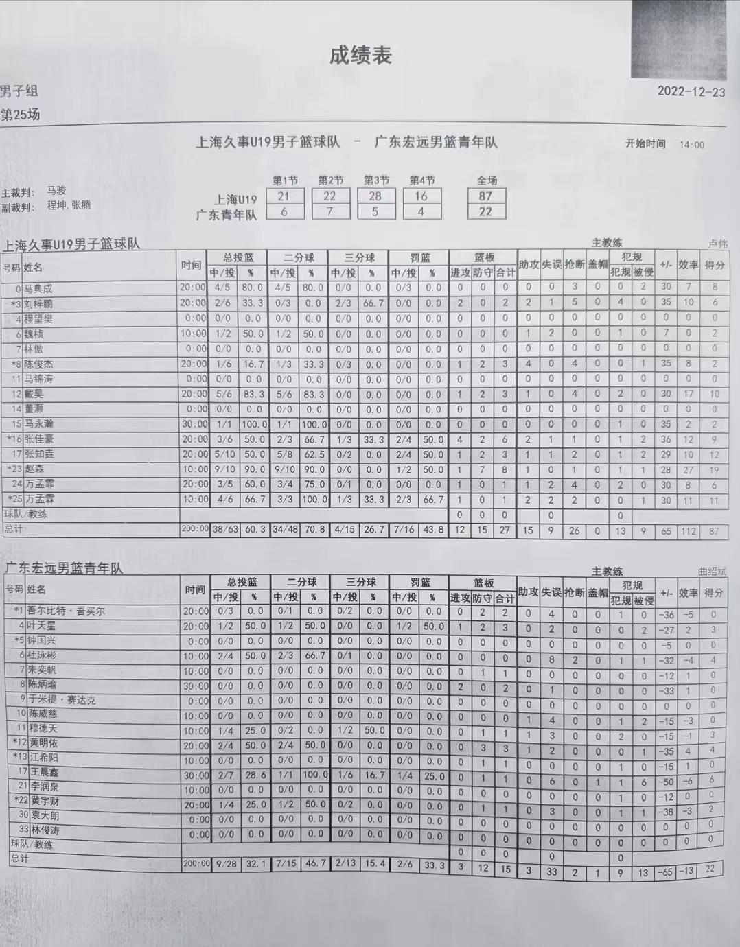廣東宏遠青年隊,慘敗輸給上海青年隊多達65分,雙方比分是22:87。