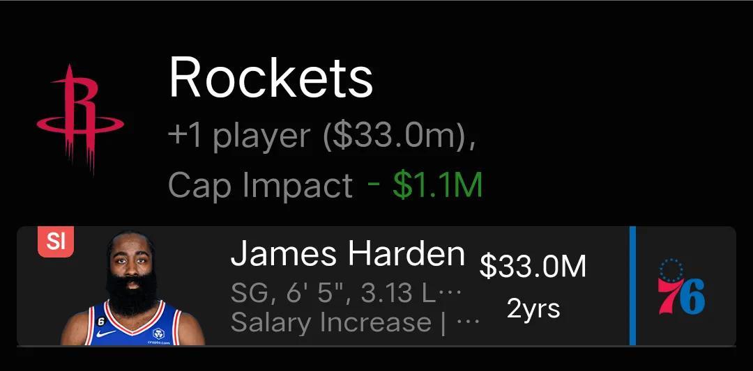 火箭保留了杰倫格林、小波特、史密斯和申京的主力陣容,送出一些角色球員,得到了持球大核哈登,球隊實力得到了補強,76人也得到了不錯的回報,避免白白地失去哈登。