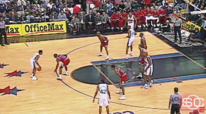 第三節比賽進行到最後4分18秒,艾弗森接到隊友威瑟斯龐的手遞手傳球,把對位防守他的羅恩·哈珀甩在身後。然而這看起來並不是一次成功的配合,因爲“錯位”之後,他對面的防守人變成了喬丹——當時的喬丹,不僅即將拿下個人第9個得分王,還將第8次入選年度最佳防守陣容一隊。