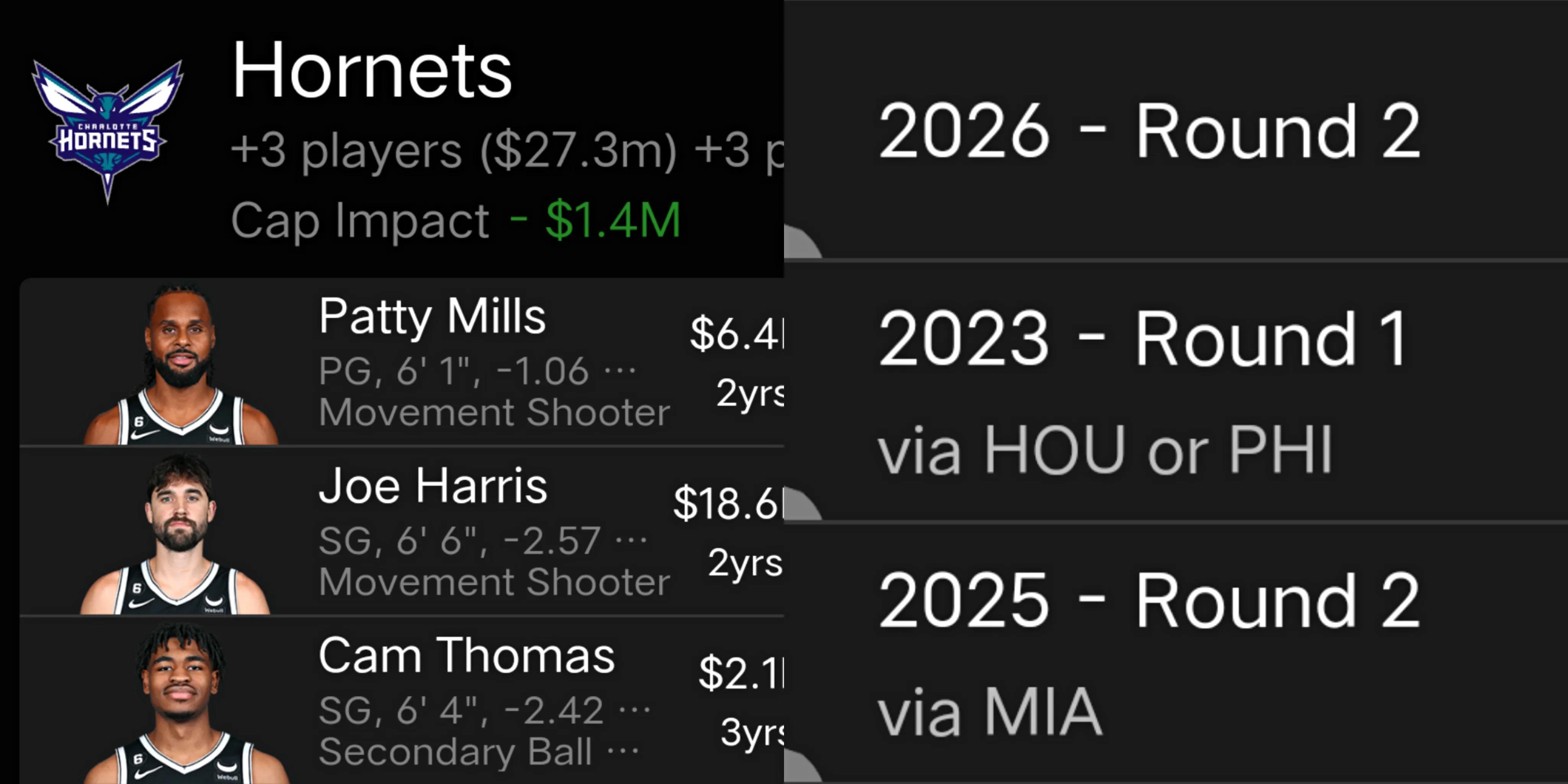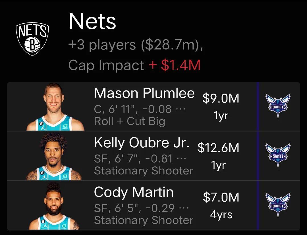 籃網送出老將後衛米爾斯,前鋒喬-哈里斯和年輕後衛托馬斯,1個首輪籤和2個次輪籤,從黃蜂隊得到中鋒普拉姆利,前鋒烏佈雷和馬丁。