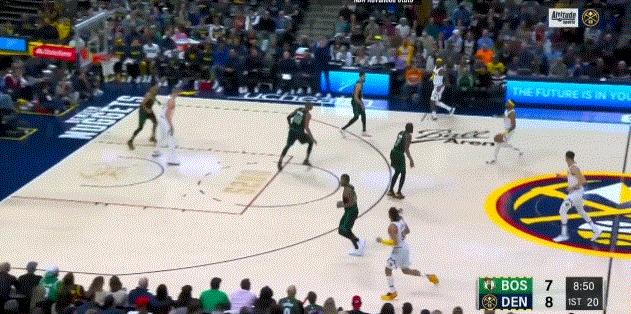 第三次錯位約基奇沒能得分也沒助攻,但布魯斯·布朗得到了一個大空位的三分球。當艾爾·霍福德和懷特試圖換防到約基奇時,掘金找到了獨自一人埋伏在底角的布朗: