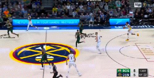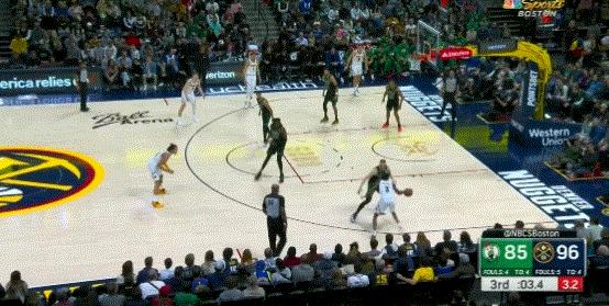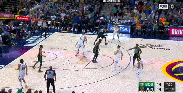 在另一次錯位防守中,德里克·懷特進行了更多抵抗,但是他的體型不足以對約基奇造成影響。在這種明顯匹配不上的回合中,凱爾特人的其他球員也並不能給予懷特太多幫助: