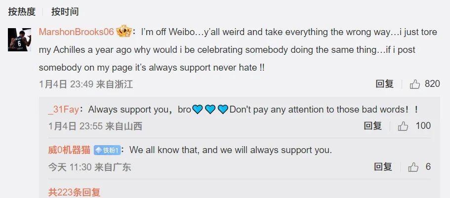 另一位廣東球員馬尚·布魯克斯也更新了個人微博爲哈達迪加油,他寫道:“快點好起來,我的兄弟!! ”