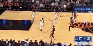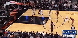 湯普森在貝恩身後緊追不捨,勇士內線也預判到了貝恩的選擇,提前補位形成干擾,熟悉而默契的防守配合。