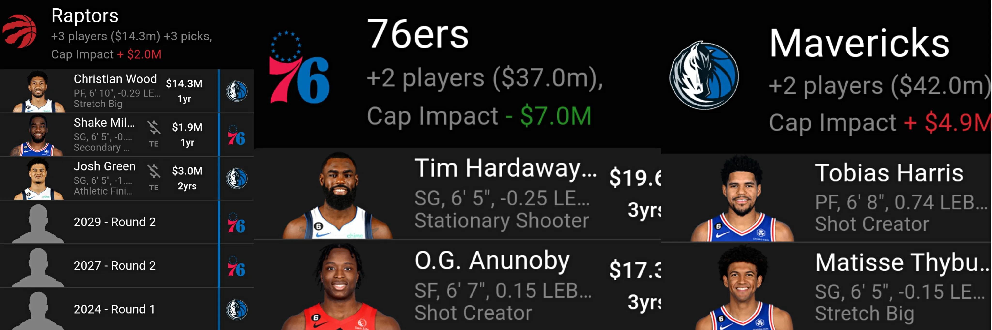 得到:伍德、米爾頓、約什格林、2024年獨行俠首輪籤和2個76人送出的未來次輪籤