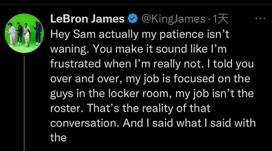 有時候是這樣,一句頂一萬句,記者立即撰文表示詹姆斯對湖人遲遲不肯用選秀權換即戰力“失去了耐心”,而NBA爆料大佬Shams對這篇文章的轉發也讓消息顯得更真實,畢竟轉發的時候大家只要看到那句“失去耐心”就行了,至於誰會點開文章仔細看一看,那可能並不佔多數。