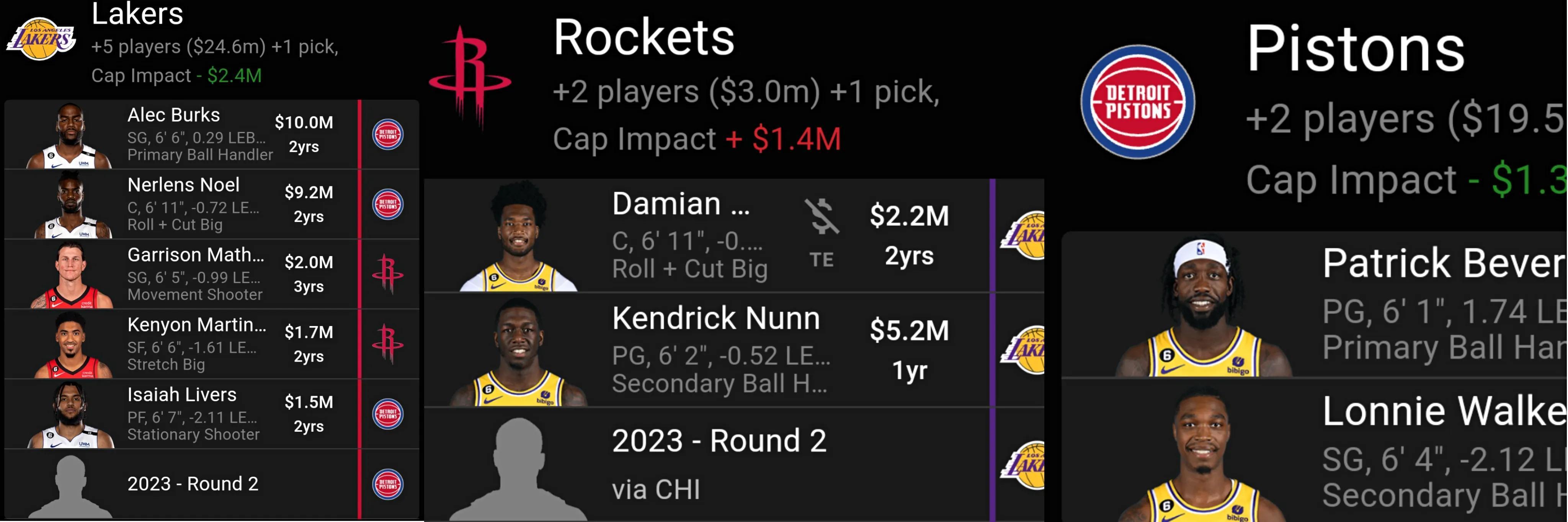 湖人送出瓊斯、納恩、貝弗利和朗尼-沃克,得到伯克斯、諾艾爾、馬修斯、小馬丁、利沃斯和2023年活塞次輪籤。
