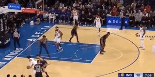 雖然身高不高,聯盟各隊也針對布朗森設計了夾擊戰術(特別是雄鹿這一場,雄鹿的長臂猿們恨不得把他包成肉夾饃),但布朗森在高壓防守下的傳球視野依然開闊,踉蹌着鎖定無人盯防的奎克利——後者前一秒還在讓布朗森傳給弧頂。