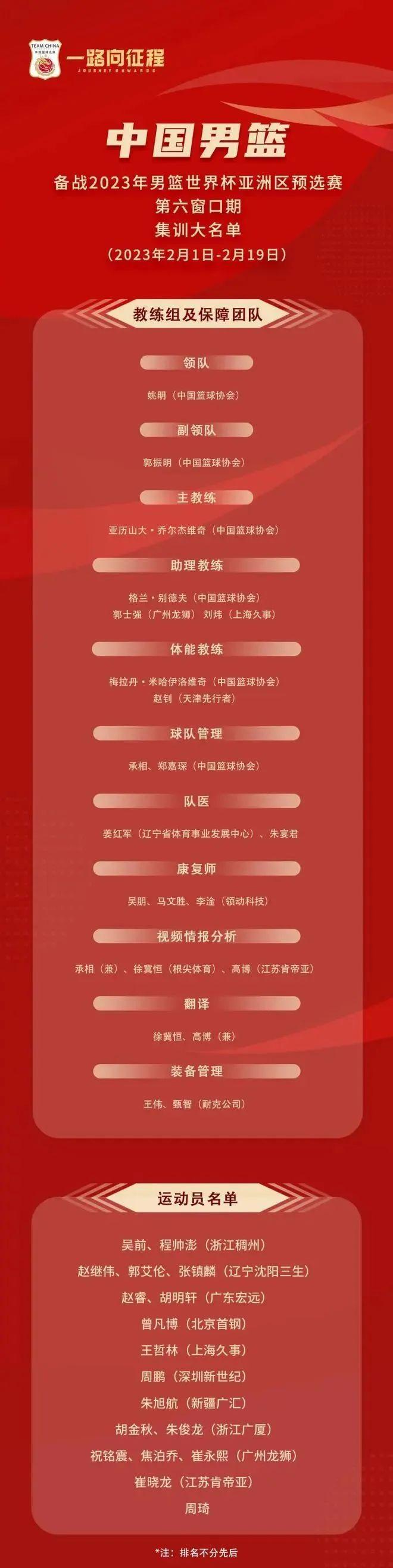 春節臨近,正是辭舊迎新的好日子。同樣是在1月19日這一天,中國籃協公佈了中國男籃備戰世預賽第六窗口期的新的18人集訓大名單。中國籃協主席姚明擔任領隊,郭士強和劉煒擔任助理教練,18名運動員包括吳前、程帥澎、趙繼偉、郭艾倫、張鎮麟、趙睿、胡明軒、曾凡博、王哲林、周鵬、朱旭航、胡金秋、朱儁龍、祝銘震、焦泊喬、崔永熙、崔曉龍、周琦。