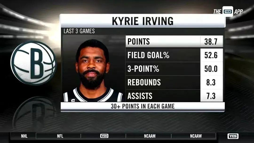 最近,我們目睹了歐文的神仙表演,最近3場,場均得到38.7分8.3籃板7.3助攻,投籃命中率52.6%,三分命中率50%。