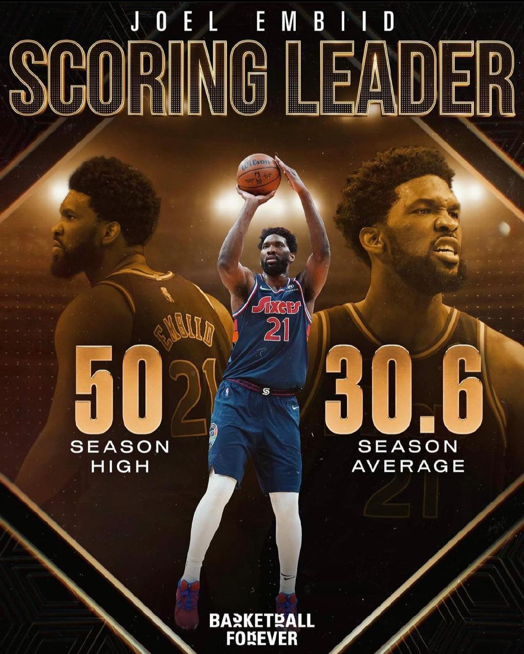 其次,恩比德已經連續兩個賽季場均得分破30,本賽季更是領跑得分王。