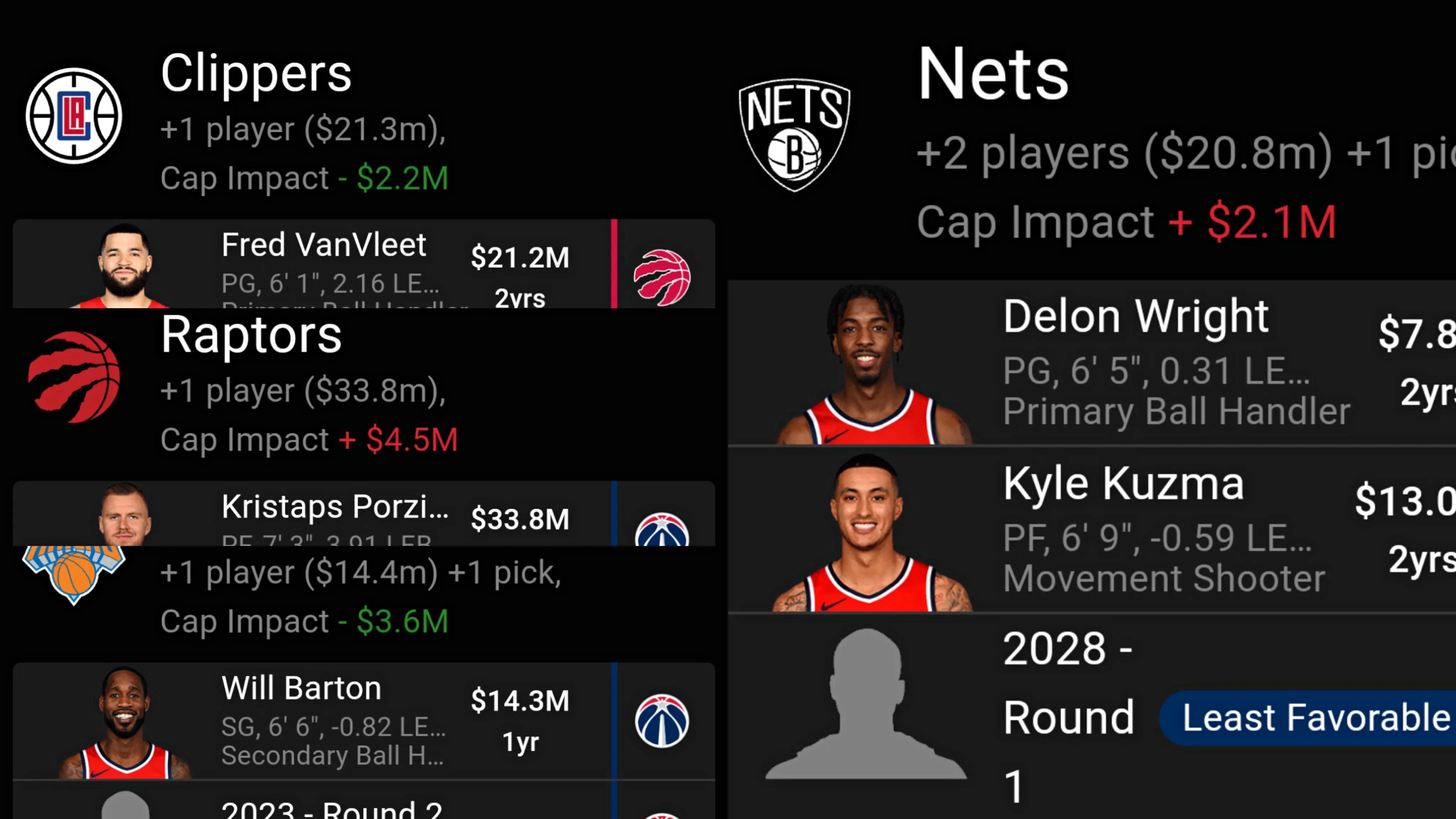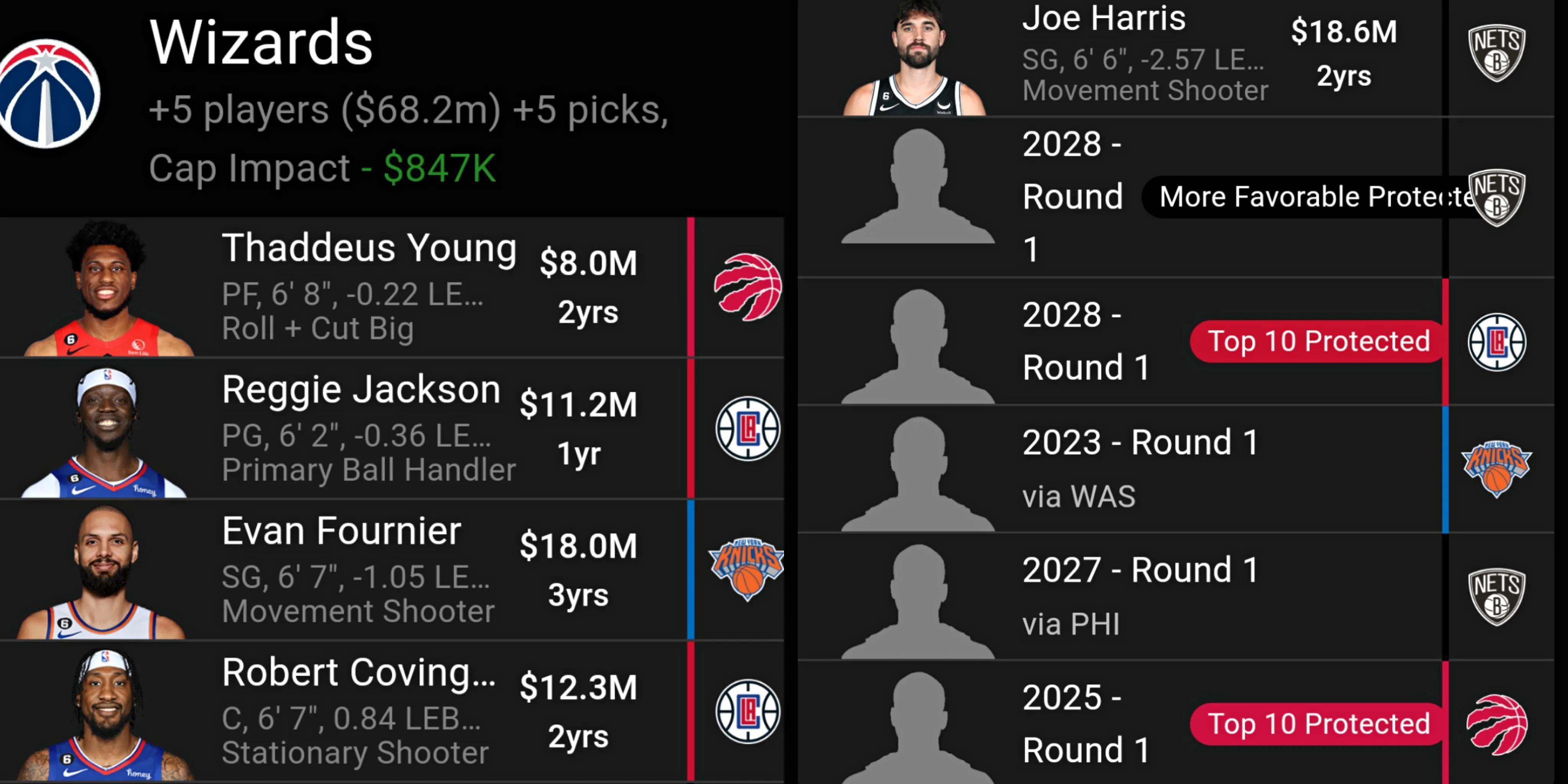 奇才隊送出:庫茲馬、巴頓、波爾津吉斯、賴特、1個首輪籤和1個次輪籤,得到楊、雷吉、富尼耶、考文頓、喬哈里斯和5個首輪籤。