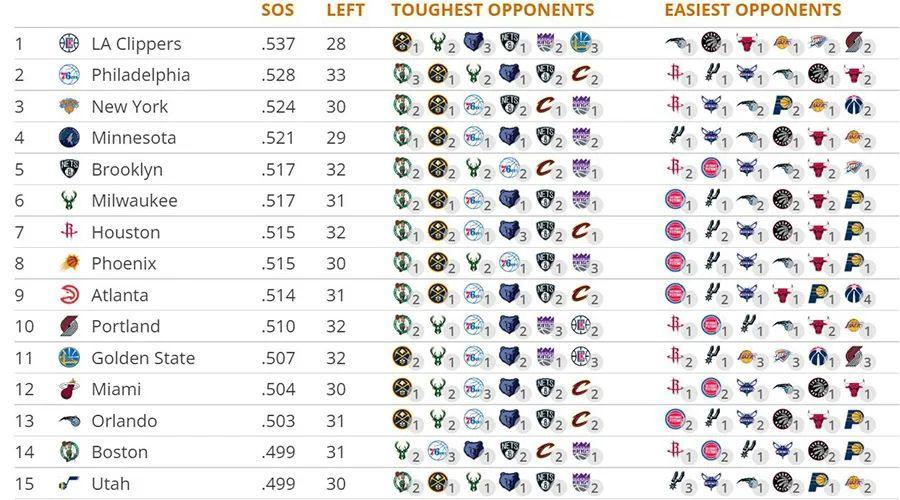 不過無需着急,有關這個問題,我們很快就會有更準確的答案:快船賽季還剩餘28場比賽,他們對手的平均勝率高達53.7%,剩餘賽程難度高居全聯盟所有球隊之首。