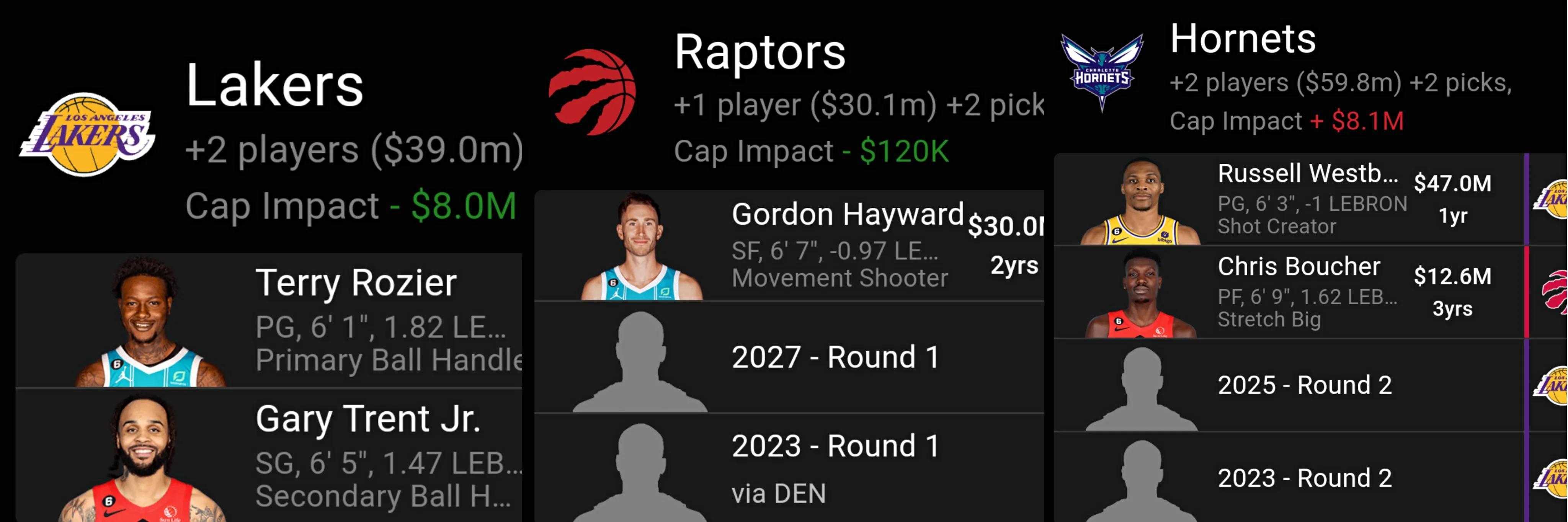 得到:海沃德、2027年湖人首輪和2023年黃蜂首輪