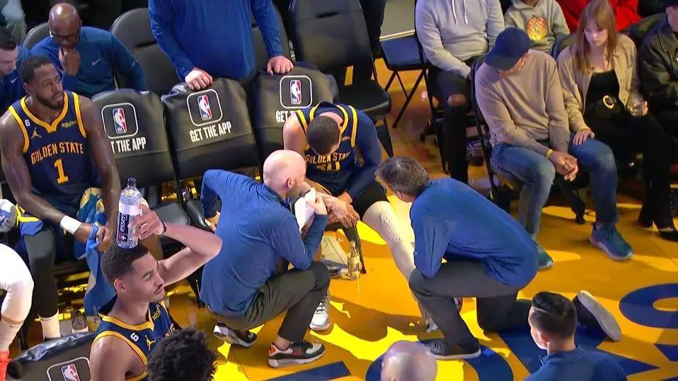 庫裏在第三節後半段防守達拉斯獨行俠後衛麥金萊·賴特突破時,被後者撞到左腿外側膝蓋,隨後痛苦地跳向觀衆席。