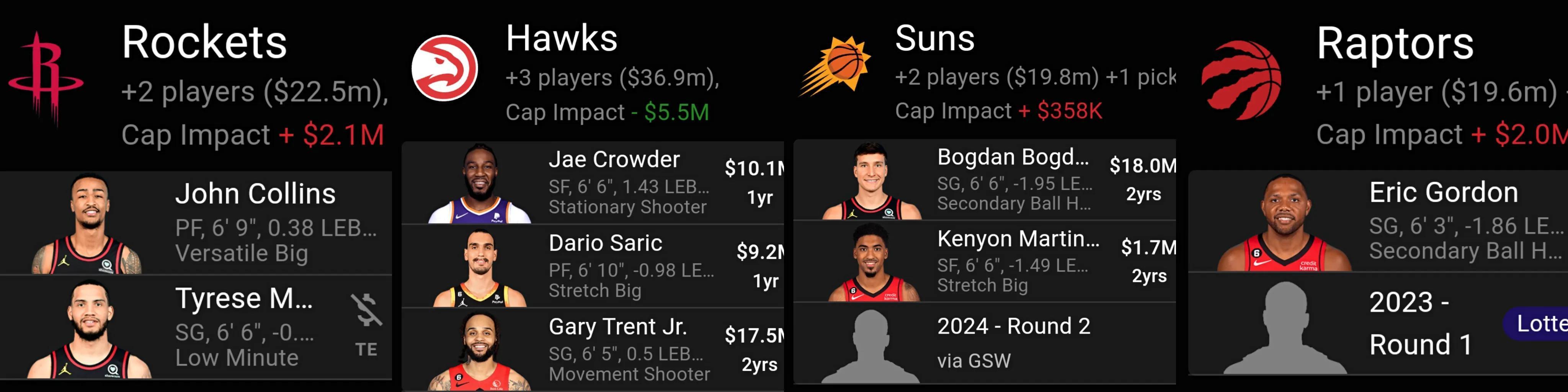 老鷹得到克勞德這位3D前鋒,鋒線防守得以加強,科林斯加盟火箭,可以提升球隊的內線進攻,博格丹和小馬丁讓太陽有更多的攻防選擇,猛龍得到戈登的到期合同和1個首輪籤,有利於球隊的重建。