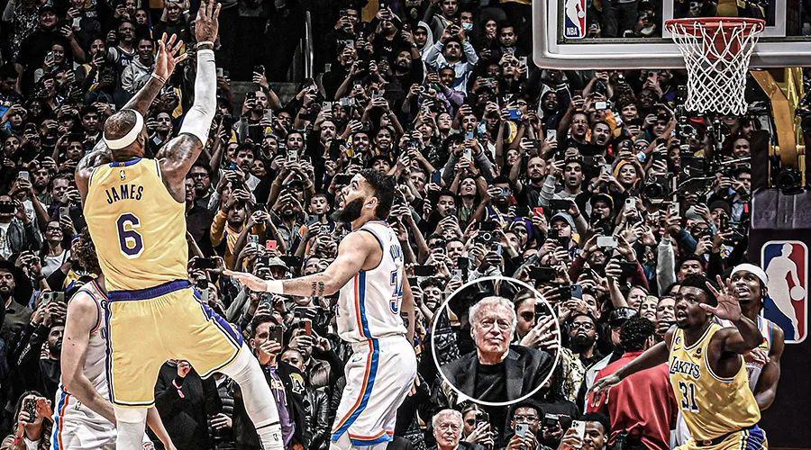 但無論如何,昨天那場球你都得看,昨天那場球我都得寫,因爲那不光是詹姆斯的生涯節點,也是NBA的重要歷史節點。丹澤爾·華盛頓、Jay-Z、Usher和Bad Bunny都來看了,賈巴爾、魔術師約翰遜、詹姆斯·沃西、鮑勃·麥卡杜和德文·韋德也來看了。當詹姆斯投出那記超越賈巴爾的翻身後仰時,觀衆席上幾乎所有的人都掏出了手機,只有一位老人淡定地看着,那是耐克公司的老闆菲爾·奈特,全世界最有名的鞋狗,他和詹姆斯合作了20年。