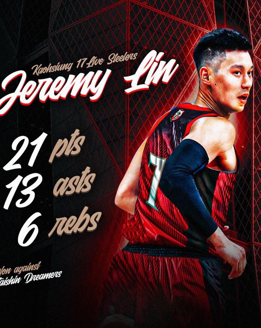 P+聯賽首秀,林書豪上場41分鐘,兩分球15中5,三分球8中3拿下21分13助攻6籃板的亮眼數據,率領鋼鐵人終止連敗在主場拿下勝利,13助攻的表現更平聯賽單場助攻紀錄。