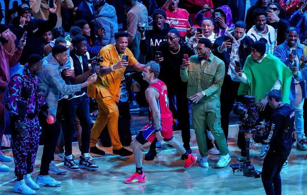 以字母哥爲首的一羣全明星球員圍繞在他的身邊,化身爲狂熱的粉絲,他們剛剛目睹的一切把他們驚得目瞪口呆。