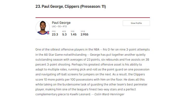 快船前鋒保羅-喬治,此次排名出現了大幅度下滑。