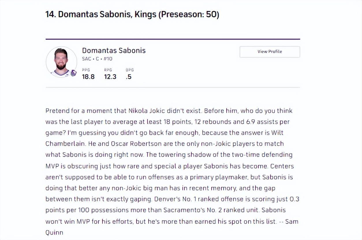 但在本期榜單裏,小薩被排在了聯盟第14位,比倫納德,濃眉,喬治,哈登等多名老牌巨星都要高。