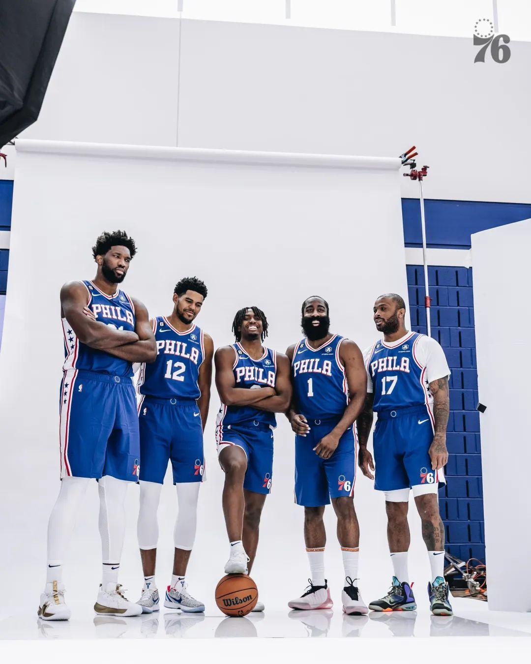 這極有可能是新賽季費城的首發5虎,我們可以看到,定妝照的5人,不同的表情。喜笑顏開的哈登,看上去悶悶不樂、若有所思的大帝...