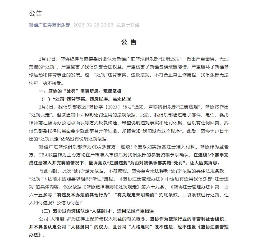 因不滿籃協的處罰結果,新疆隊已於今日凌晨發表聲明,將退出CBA以示抗議。