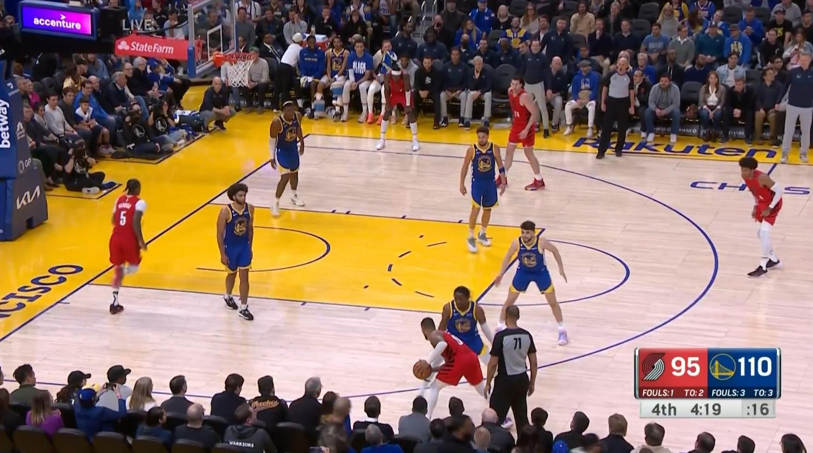 比賽進入下半場後,風雲突變。就第三節,勇士隊單節轟出39-17,單節淨勝22分,第三節結束勇士隊已經反超開拓者5分。