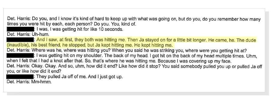 “莫蘭特打了我12到13下。”該少年說道,他還補充說莫蘭特的朋友也打了他四五下。當警察問該少年毆打的力度有多大時,他將其力度與MMA綜合格鬥相提並論。