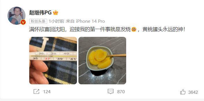 就在郭艾倫發文之後沒過多久,遼寧男籃後場的另一位核心趙繼偉,也是宣佈了自己生病的消息,雖然趙繼偉的體溫對比郭艾倫,並沒有燒到那麼高的問題,但同樣的問題是,他也無法繼續出場比賽,不過樂觀的趙繼偉,還是不忘用東北特產“黃桃罐頭”來給自己加油打氣。