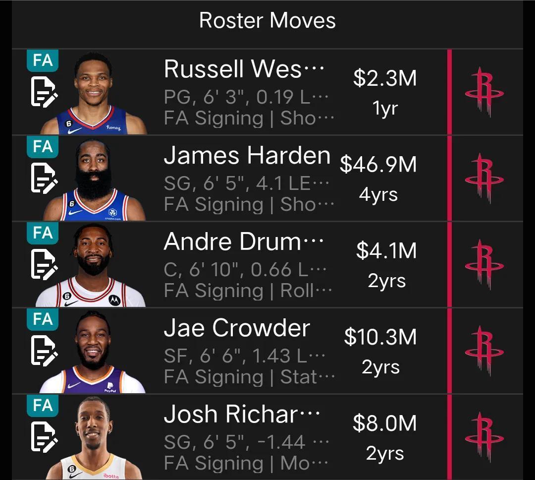 這五位球員分別是哈登、威少、德拉蒙德、克勞德和約什理查德森,其中三位是後衛,一位是前鋒,一位是中鋒,可以看出火箭補強後衛的決心。