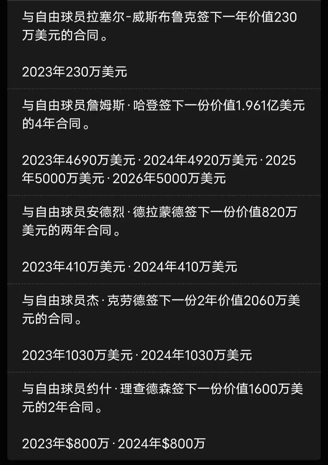 火箭將以兩年820萬美元簽約中鋒德拉蒙德,與前鋒克勞德簽下一份兩年2060萬美元的合同,與約什理查德森簽下一份兩年1600萬美元的合同,與威少簽約一份一年230萬美元的合同。
